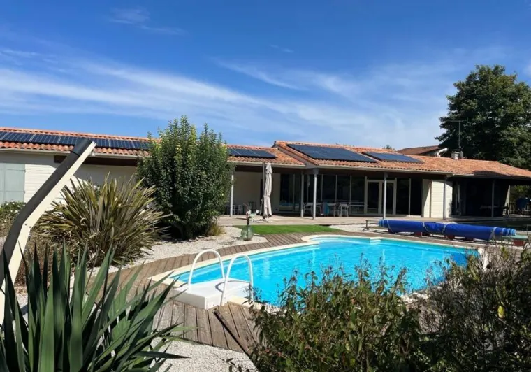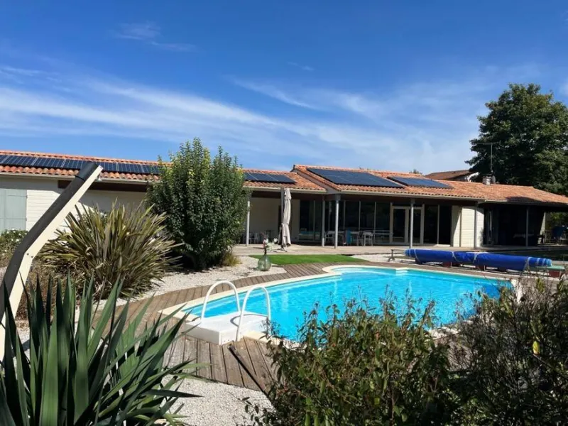 Proche du centre ville, cette maison de plein pied, ossature bois, atypique et unique de 220 m2, a une forme arrondie qui lui donne un design d'élégance.Elle ouvre sur un grand hall d'entrée de 8.70m2. La pièce de vie est de 70m2, la cuisine est toute équipée avec un îlot central, la salle à manger et salon.