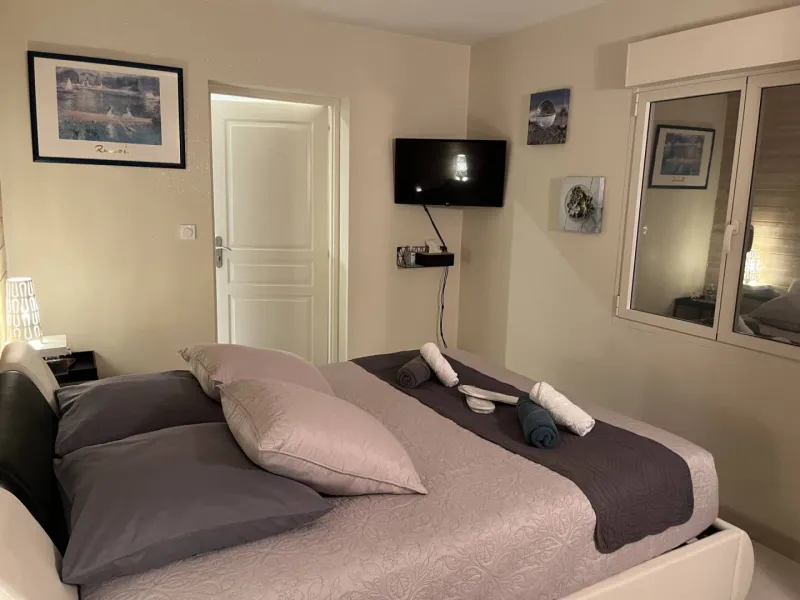 les lits sont en160, matelas mémoire de forme, La spacieuse peut être complétée avec un lit d'appoint 1 personnes et deux chambres peuvent accueillir un lit bébé (sur demande, tarif en sus).