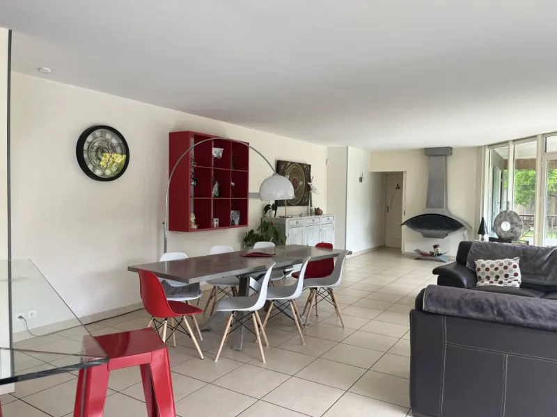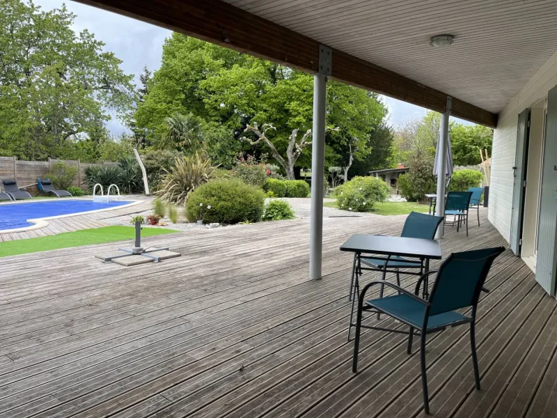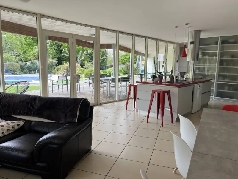 Cette pièce entièrement vitrée laisse entrer la lumière dans la maison, elle donne sur la piscine et le parc avec sa terrasse en bois de 73m2 semi- couverte.