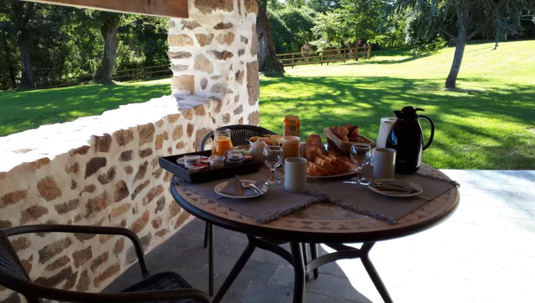 Aménagée avec beaucoup de gout et de confort. Accès PMR. Kitchenette (plaques électriques, réfrigérateur, micro-ondes) Terrasse privative couverte avec vue imprenable sur la nature. Petit déjeuner proposé en extérieur ou dans la chambre.
