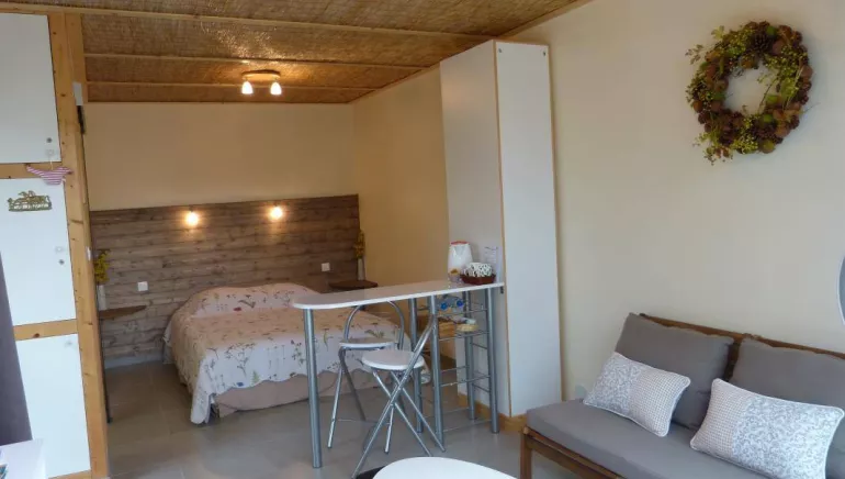 La chambres d'hôtes "Le Nid" est située à l'étage avec un accès par un escalier extérieur. Petite terrasse. Les deux chambres d'hôtes disposent d'un espace détente avec canapé, TV, bouilloire, thé et café ainsi que des petites spécialités de saison maison(confitures , patisseries). Wifi sur demande, gratuit. Espace nuit avec un lit double (140). Salle d'eau/WC (sèche-cheveux).