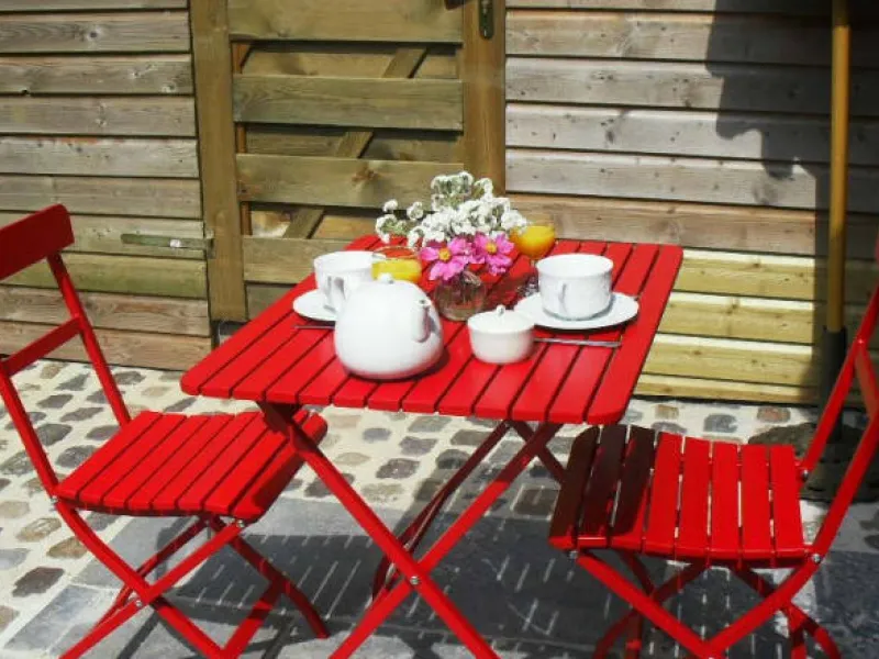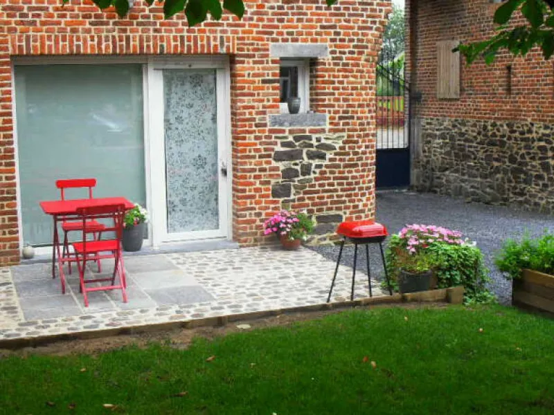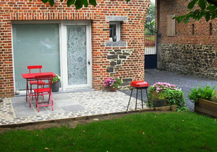 Jardin privatif, terrasse, salon de jardin, barbecue.