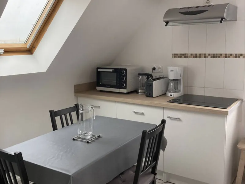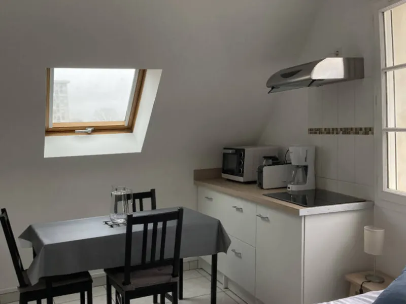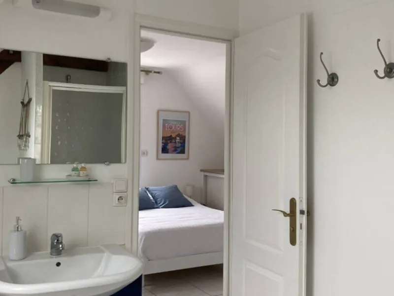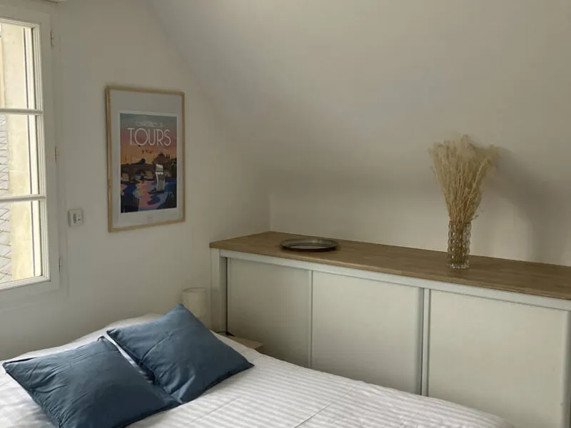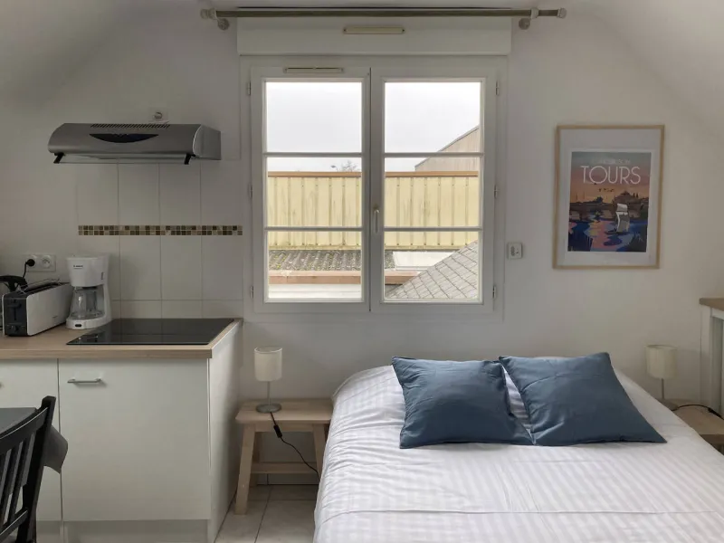 Studio de 15m² (**). A l'étage. Entièrement meublé. Location pour courtes, moyennes durées. Ce gîte se situe à quelques minutes à vélo du centre de Tours. Prestations de qualité. Chauffage au sol. Rangement. Cuisine entièrement équipée.Un lit double. Possibilité d'un fauteuil convertible pour la 3ème personne (un supplément).