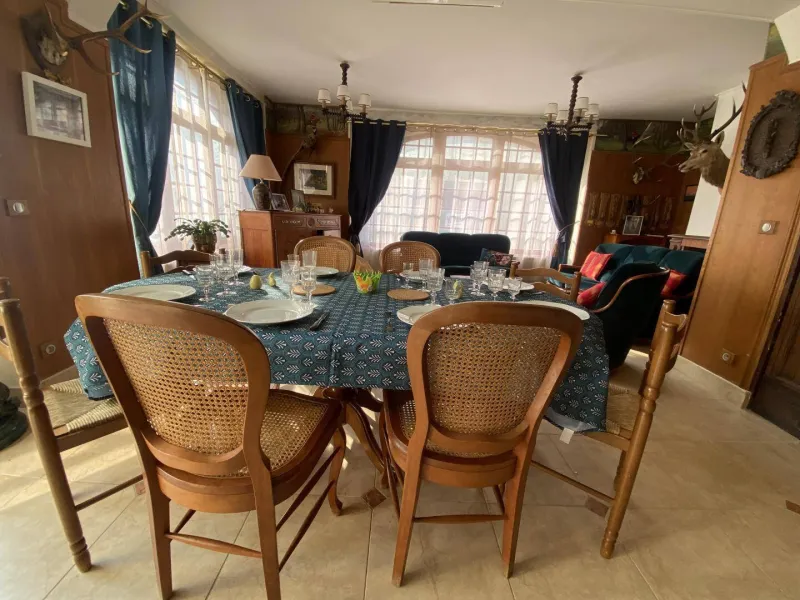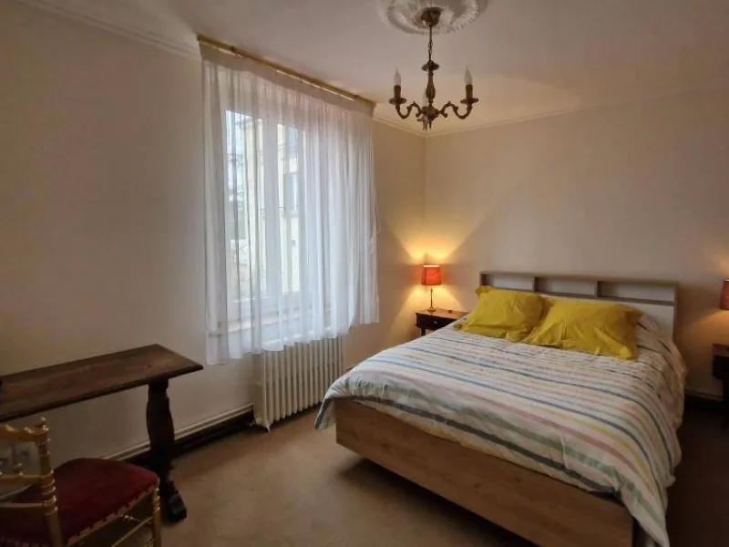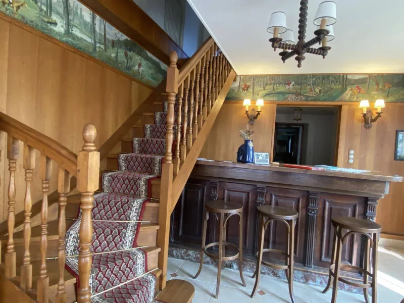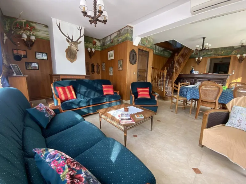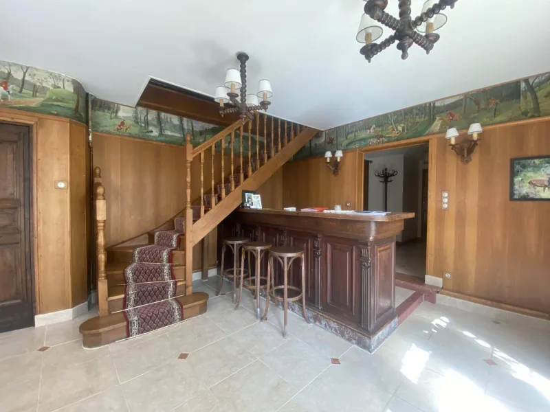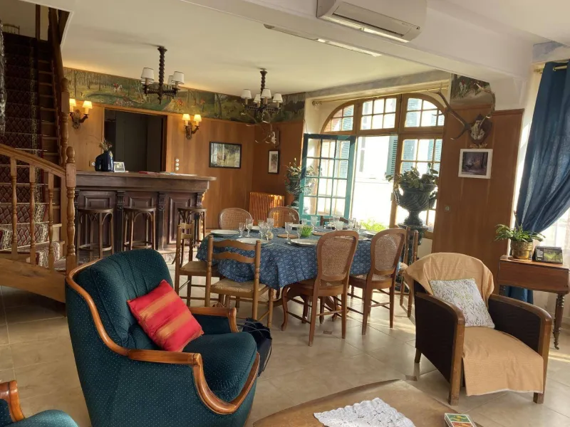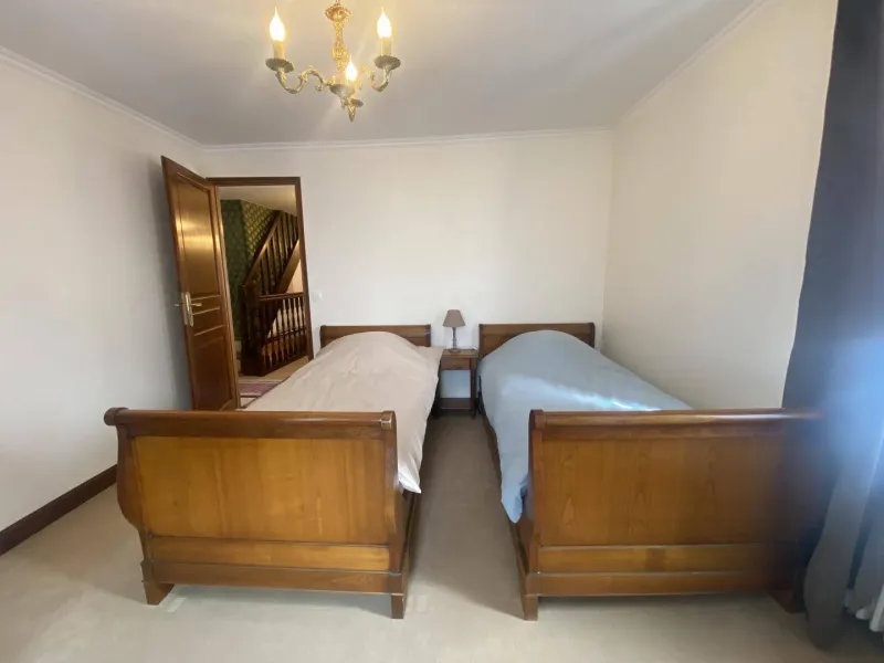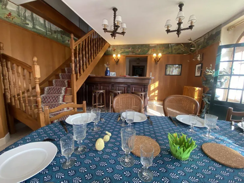 Magnifique parc dans lequel il est possible de se promener. A disposition un petit espace privatif à l'extérieur avec mobilier de jardin. Le gîte "Les Chasses" est composé : Au rez-de-chaussée d'une grande salle de vie avec imposant bar en bois d'époque et cheminée décorative (ne pas utiliser). Les fresques peintes qui courent tout autour de la pièce, vous donnent dès votre arrivée dans les lieux l'esprit de la demeure et vous emportent au début du siècle dernier. Grande cuisine d'époque avec puits de lumière dans laquelle il sera très agréable de préparer les repas. Un WC indépendant au rez-de-chaussée. A l'étage 3 chambres :- 1 chambre avec 1 lit double (140 x 190) et sa salle de bains privative avec WC.