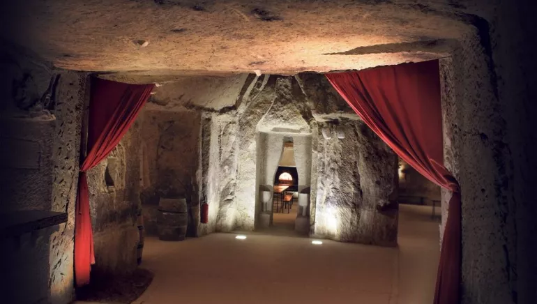 Ancienne carrière d'extraction de Tuffeau dont les parois sont sculptées sur le thème d'un conte du Tiers Livre de Rabelais: La Sibylle de Panzoult, que rencontrent Panurge et son ami pour tenter d'obtenir des réponses sur le futur mariage de Panurge. Chaque niche sculptée dispose d'un chevalet expliquant le passage de l'histoire. Une scénographie plonge les visiteurs dans les songes de Panurge au fond de la cave (son et lumières). Film d'animation didactique court (environ 8 min) en fin de parcours sur le travail de la vigne au fil des saisons. A la fin de la visite, dégustation sélectionnée et commentée de 5 vins (1 blanc, 1 rosé et 3 rouges) en AOP Chinon des vignerons de Panzoult. Possibilités d'achats de vins dans la boutique et produits du terroir local disponibles également.